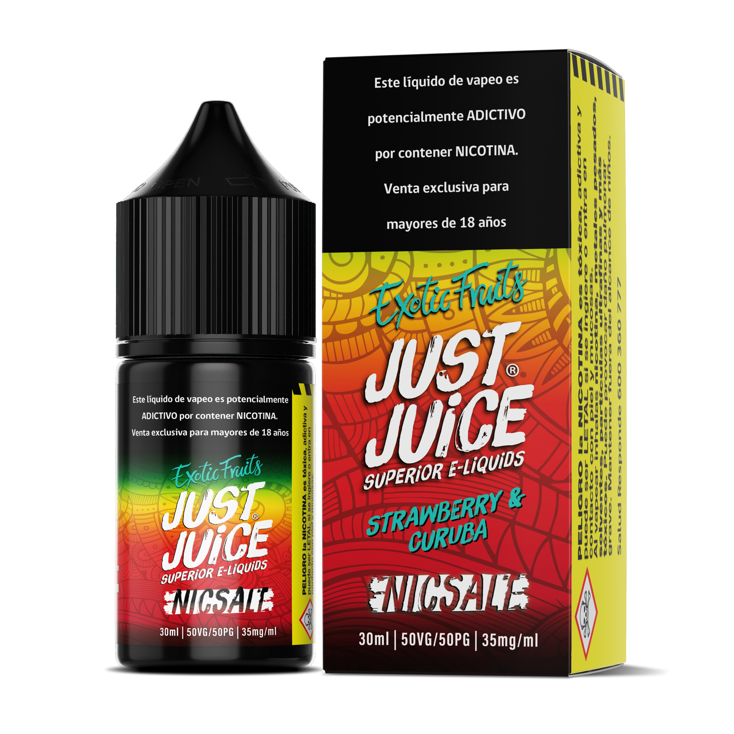 Una combinación exótica y refrescante. El Just Juice Strawberry & Curuba Super Ice Salt Nic 35mg fusiona el dulzor jugoso de la frutilla madura con el sabor tropical y ligeramente ácido de la curuba (fruta de la pasión banana), todo acompañado por una explosión de frescor helado que potencia cada nota frutal.